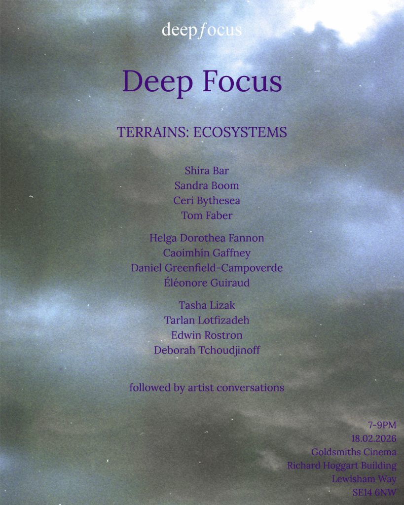 Deep Focus presents their next artist film and video screening on Wednesday 18 February 2026. Ecosystems is the first screening in the Terrains series and will be held at the cinema within Goldsmiths, showcasing films that investigate links between subject, culture and territory.